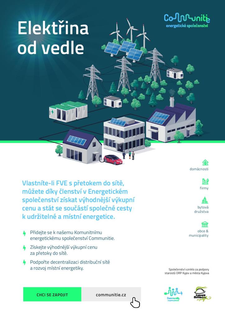 Pokud vlastníte fotovoltaickou elektrárnu s přetokem do sítě, máte možnost se zapojit do Energetického společenství Communitie. Díky členství můžete získat výhodnější výkupní cenu za přetoky a podpořit rozvoj místní energetiky. Společenství vzniklo s podporou starostů ORP Kyjov a města Kyjova a je určeno pro domácnosti, firmy, bytová družstva a obce. Připojte se k nám a buďte součástí udržitelné energetiky.