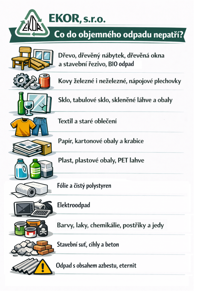 Společnost EKOR, s.r.o. se zaměřuje na efektivní sběr a třídění různých druhů odpadu. Mezi tyto odpady patří dřevo, kovy, papír, plasty a elektroodpad. Je důležité správně třídit odpad, abychom přispěli k ochraně životního prostředí a zajištění recyklace. Názorný a praktický leták je k informaci i pro občany u přistavených velkých kontejnerů v obcích a při mobilním sběru.