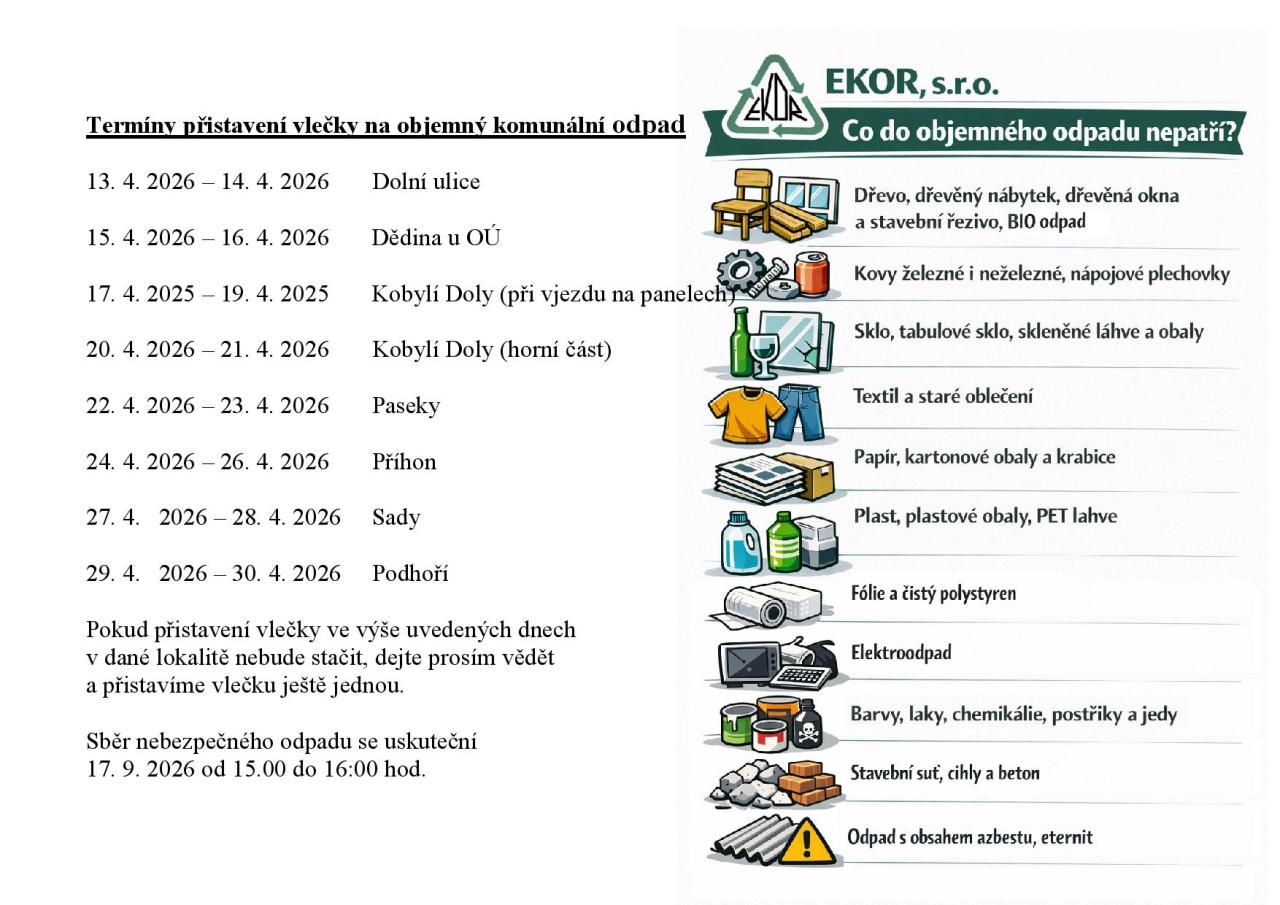 V průběhu dubna 2026 budou v obci probíhat termíny přistavení vlečky na objemný komunální odpad. Obyvatelé mohou využít přistavení vlečky od 13. do 30. dubna 2026. Dbejte prosím pokynům společnosti Ekor "Co do objemného odpadu nepatří", dále tam nepatří pneumatiky. Sběr nebezpečného odpadu se uskuteční 17. září 2026 v odpoledních hodinách.